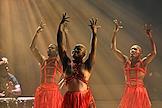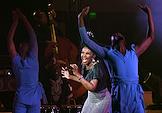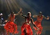Семнадцатый Международный театральный фестиваль имени А.П.Чехова. Музыкальный спектакль "МОЙЯ" певицы Симфиве Даны и Театра танца Вуяни (ЮАР) на сцене Концертного зала "Зарядье". Певица Симфиве Дана (в центре) во время выступления.