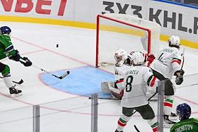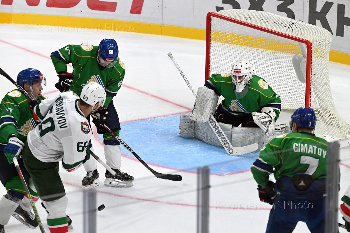 Суперфинал чемпионата Континентальной хоккейной лиги (КХЛ) в формате "3х3" на стадионе "ЦСКА Арена". Финал. Матч между командами "Салават Юлаев" (Уфа) - "Ак Барс" (Казань). Вратарь команды "Ак Барс" Александр Лазушин (слева) во время матча.