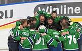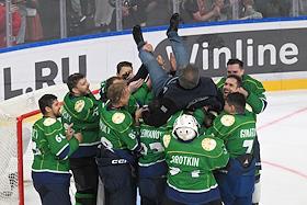 Суперфинал чемпионата Континентальной хоккейной лиги (КХЛ) в формате "3х3" на стадионе "ЦСКА Арена". Финал. Матч между командами "Салават Юлаев" (Уфа) - "Ак Барс" (Казань). Игроки команды "Салават Юлаев" после матча.