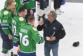 Суперфинал чемпионата Континентальной хоккейной лиги (КХЛ) в формате "3х3" на стадионе "ЦСКА Арена". Финал. Матч между командами "Салават Юлаев" (Уфа) - "Ак Барс" (Казань). Главный тренер команды "Салават Юлаев" Руслан Сулейманов (справа) во время церемонии награждения после матча.