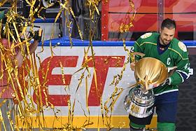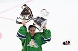 Суперфинал чемпионата Континентальной хоккейной лиги (КХЛ) в формате "3х3" на стадионе "ЦСКА Арена". Финал. Матч между командами "Салават Юлаев" (Уфа) - "Ак Барс" (Казань). Игрок команды "Салават Юлаев" Никита Щитов на церемонии награждения после матча.