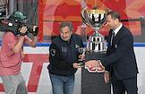 Суперфинал чемпионата Континентальной хоккейной лиги (КХЛ) в формате "3х3" на стадионе "ЦСКА Арена". Финал. Матч между командами "Салават Юлаев" (Уфа) - "Ак Барс" (Казань). Президент КХЛ Алексей Морозов (справа) на церемонии награждения после матча.