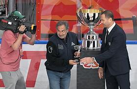 Суперфинал чемпионата Континентальной хоккейной лиги (КХЛ) в формате "3х3" на стадионе "ЦСКА Арена". Финал. Матч между командами "Салават Юлаев" (Уфа) - "Ак Барс" (Казань). Главный тренер команды "Салават Юлаев" Руслан Сулейманов (слева) и президент КХЛ Алексей Морозов (справа) на церемонии награждения после матча.