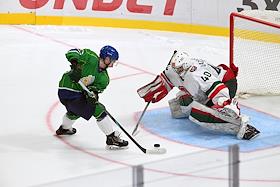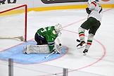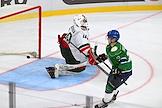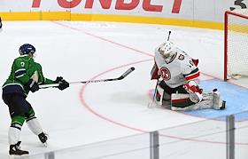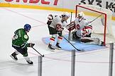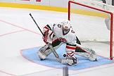 Суперфинал чемпионата Континентальной хоккейной лиги (КХЛ) в формате "3х3" на стадионе "ЦСКА Арена". Финал. Матч между командами "Салават Юлаев" (Уфа) - "Ак Барс" (Казань). Вратарь команды "Ак Барс" Александр Лазушин во время матча.