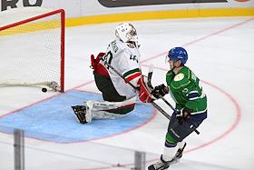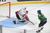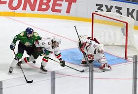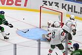 Суперфинал чемпионата Континентальной хоккейной лиги (КХЛ) в формате "3х3" на стадионе "ЦСКА Арена". Финал. Матч между командами "Салават Юлаев" (Уфа) - "Ак Барс" (Казань). Вратарь команды "Ак Барс" Александр Лазушин (справа) во время матча.