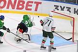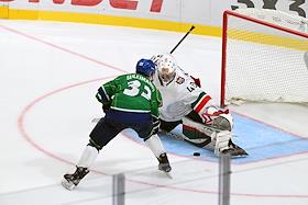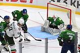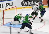 Суперфинал чемпионата Континентальной хоккейной лиги (КХЛ) в формате "3х3" на стадионе "ЦСКА Арена". Финал. Матч между командами "Салават Юлаев" (Уфа) - "Ак Барс" (Казань). Вратарь команды "Салават Юлаев" Юрий Сироткин (слева) во время матча.
