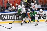 Суперфинал чемпионата Континентальной хоккейной лиги (КХЛ) в формате "3х3" на стадионе "ЦСКА Арена". Финал. Матч между командами "Салават Юлаев" (Уфа) - "Ак Барс" (Казань). Вратарь команды "Салават Юлаев" Юрий Сироткин (второй справа) во время матча.