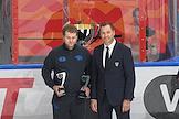 Суперфинал чемпионата Континентальной хоккейной лиги (КХЛ) в формате "3х3" на стадионе "ЦСКА Арена". Финал. Матч между командами "Салават Юлаев" (Уфа) - "Ак Барс" (Казань). Вратарь команды "Салават Юлаев" Юрий Сироткин (слева) и президент КХЛ Алексей Морозов (справа) на церемонии награждения после матча.