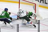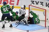 Суперфинал чемпионата Континентальной хоккейной лиги (КХЛ) в формате "3х3" на стадионе "ЦСКА Арена". Финал. Матч между командами "Салават Юлаев" (Уфа) - "Ак Барс" (Казань). Вратарь команды "Салават Юлаев" Юрий Сироткин (в центре) во время матча.
