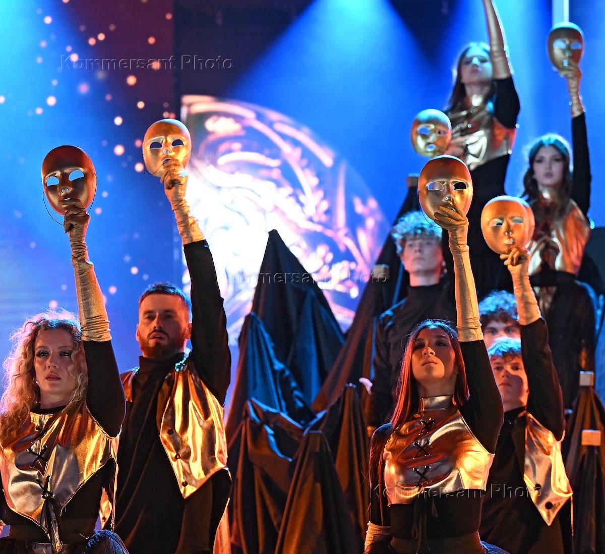 XXXIV Международный фестиваль искусств "Славянский базар" в Витебске. Концерт "Ритмы лета" в Витебском центральном спортивном комплексе. Телеведущая, певица Ольга Бузова (в центре) и певец Алексей Воробьев (слева) во время выступления.