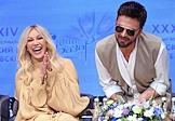 XXXIV Международный фестиваль искусств "Славянский базар" в Витебске. Пресс-конференция членов жюри по итогам первого конкурсного дня. Певцы Таисия Повалий (председатель жюри конкурса молодых исполнителей) (слева) и Александр Панайотов (справа) во время пресс-конференции.
