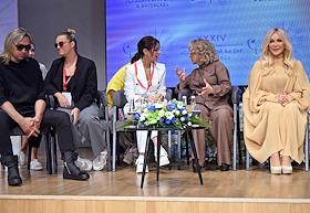 XXXIV Международный фестиваль искусств "Славянский базар" в Витебске. Пресс-конференция членов жюри по итогам первого конкурсного дня. Справа налево: председатель жюри конкурса молодых исполнителей, певица Таисия Повалий, члены жюри грузинская певица Этери Бериашвили и итальянская певица Антонелла Буччи во время пресс-конференции.