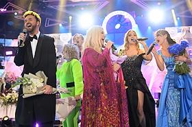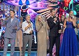 XXXIV Международный фестиваль искусств "Славянский базар". Концерт торжественного закрытия фестиваля. Слева направо: певцы Сергей Любавин, Олег Газманов, Лариса Долина, Алексей Воробьев и Ольга Бузова во время выступления.