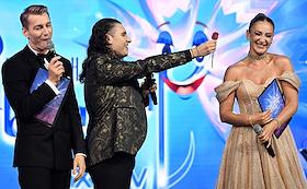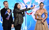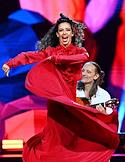 XXXIV Международный фестиваль искусств "Славянский базар". Торжественная церемония закрытия фестиваля. Певица Таисия Повалий (слева) и певица из Казахстана Алмагуль Батталиева (в центре) во время церемонии награждения.