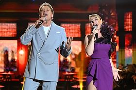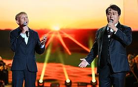 XXXIV Международный фестиваль искусств "Славянский базар". Концерт торжественного закрытия фестиваля. Певцы Александр Панайотов (слева) и Таисия Повалий (в центре) во время концерта.