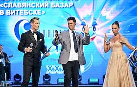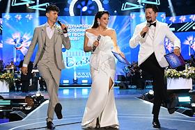 XXXIV Международный фестиваль искусств "Славянский базар". Концерт торжественного закрытия фестиваля. Слева направо: певцы Алексей Воробьев, Марьян Флорин Бурча (Румыния) и Ольга Бузова во время концерта.