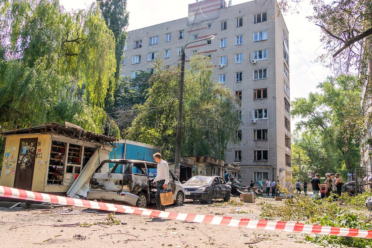 Последствия попадания беспилотного летательного аппарата (БПЛА) на жилой район города. Разбитий автомобили и торговая палатка.