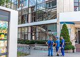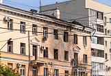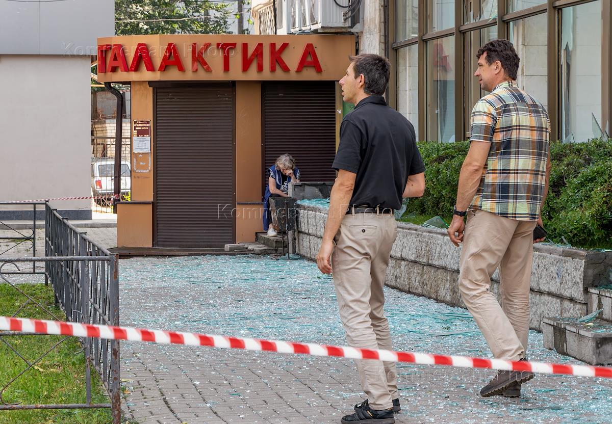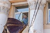 Последствия попадания беспилотного летательного аппарата (БПЛА) на жилой район города. Выбитые окна в жилом доме.