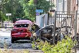 Последствия попадания беспилотного летательного аппарата (БПЛА) на жилой район города. Разбитие автомобили у дома.