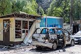 Последствия попадания беспилотного летательного аппарата (БПЛА) на жилой район города. Разбитий автомобили и торговая палатка.