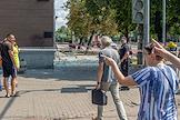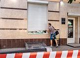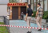 Последствия попадания беспилотного летательного аппарата (БПЛА) на жилой район города. Стекла разбитых окон на тротуаре.