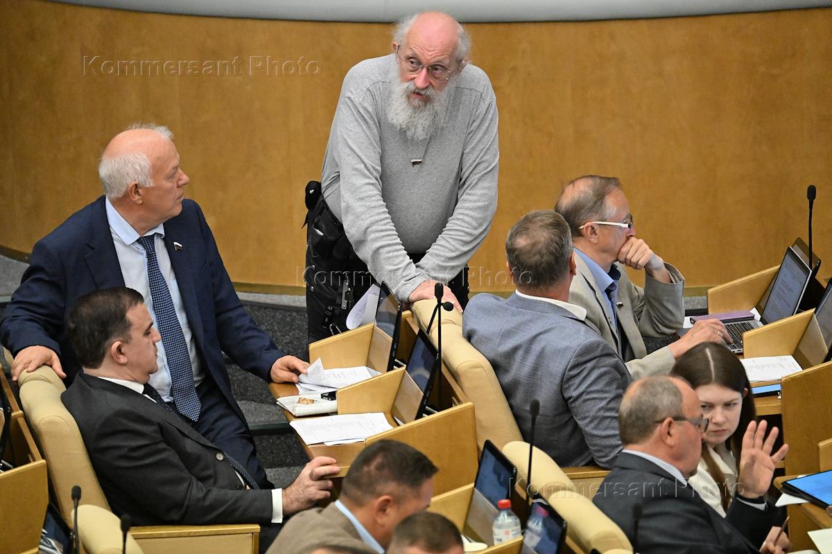 Пленарное заседание Государственной думы (ГД) России. Заместитель председателя комитета ГД России по экологии и охране окружающей среды Анатолий Грешневиков (слева) и член комитета ГД России по просвещению Анатолий Вассерман (в центре) во время заседания.