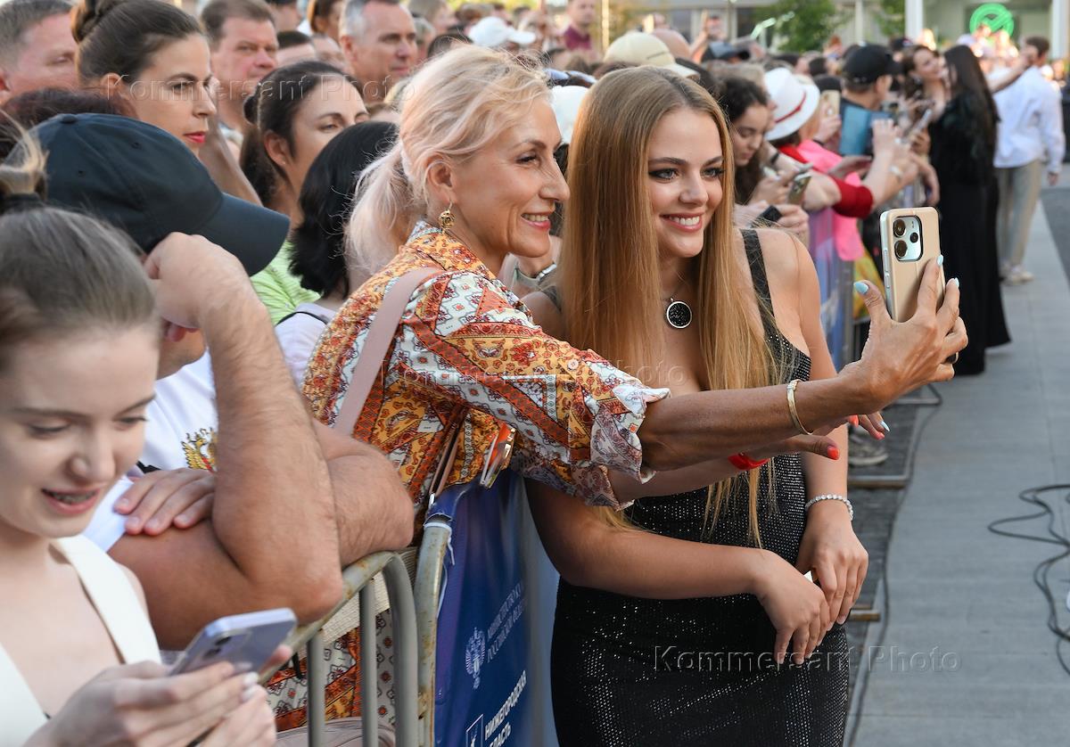IX фестиваль нового российского кино "Горький Fest". Церемония закрытия в Нижегородском государственном академическом театре драмы имени Максима Горького. Актриса Маргарита Аброськина (справа) на красной дорожке перед началом церемонии.