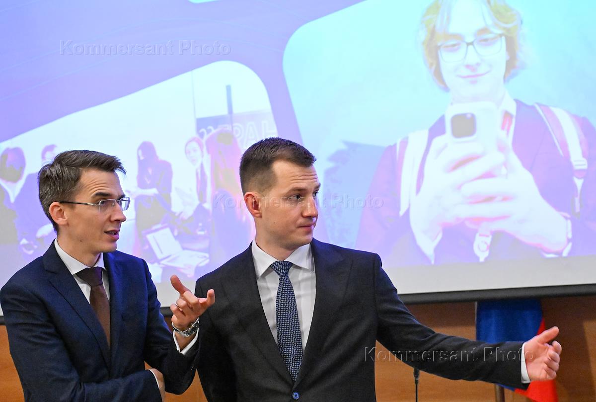 Заседание экспертного совета комитета Государственной думы (ГД) России по молодежной политике на тему "Цифровой профиль молодого человека" в ГД России. Директор Департамента цифровой трансформации и приоритетных проектов Министерства просвещения России Андрей Горобец (слева) и заместитель директора Департамента стратегии, программной и проектной деятельности Министерства просвещения России Алеся Кветинская (справа) во время заседания.