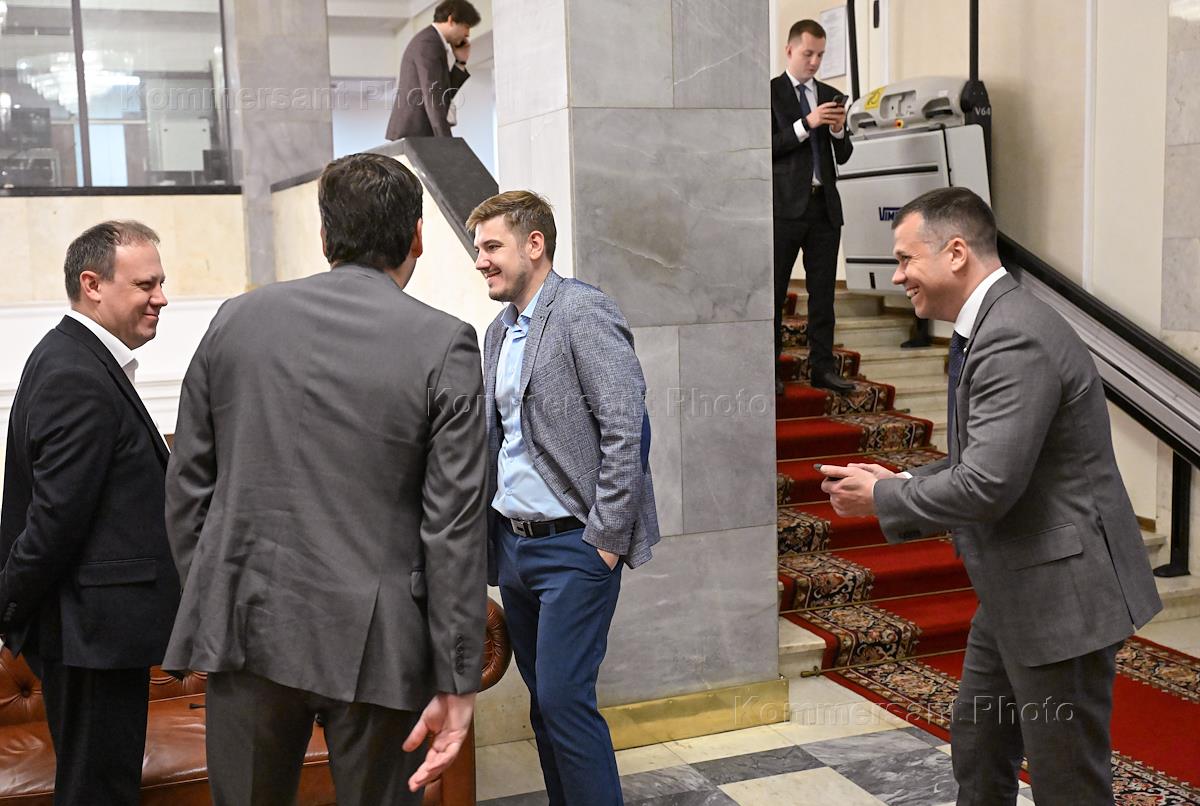 Заседание экспертного совета комитета Государственной думы (ГД) России по молодежной политике на тему "Цифровой профиль молодого человека" в ГД России. Председатель Комитета ГД России по молодежной политике Артем Метелев (справа) и заместитель министра науки и высшего образования России Андрей Омельчук (второй справа) перед началом заседания.