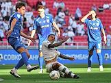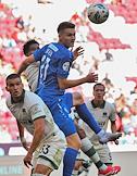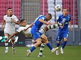 Мир Российская Премьер-Лига (РПЛ) 2025/2026. 1-й тур. Матч между командами "Пари Нижний Новгород" (Нижний Новгород) - "Краснодар" (Краснодар) на стадионе "Ак Барс Арена". Игрок команды "Краснодар" Густаво Фуртадо (в центре) и вратарь команды "Пари Нижний Новгород" Никита Медведев (слева) во время матча.