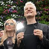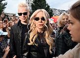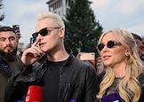 Премьерный показ клипа SHAMAN (Ярослава Дронова) на песню "Прямо по сердцу", написанную для международного музыкального конкурса "Интервидение", на медиафасаде здания на Новом Арбате. Глава Лиги безопасного интернета Екатерина Мизулина (слева) и певец SHAMAN (Ярослав Дронов) (справа) во время показа.