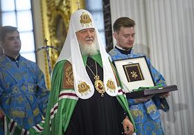 Праздник явления иконы Пресвятой Богородицы во граде Казани. Божественная литургия после Крестного хода с Казанской иконой Божией Матери. Патриарх Московский и Всея Руси Кирилл (слева) награждает председателя Либерально-демократической партии России (ЛДПР) Леонида Слуцкого (в центре) орденом Александра Невского.