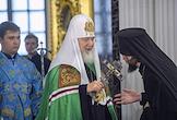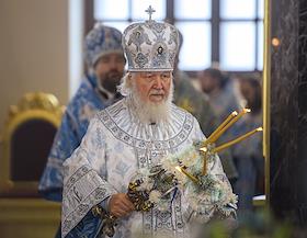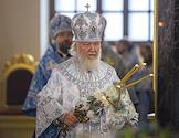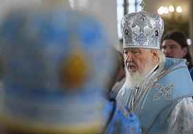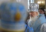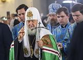 Праздник явления иконы Пресвятой Богородицы во граде Казани. Божественная литургия после Крестного хода с Казанской иконой Божией Матери. Патриарх Московский и Всея Руси Кирилл во время богослужения.