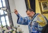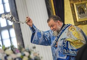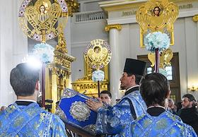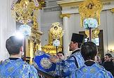 Праздник явления иконы Пресвятой Богородицы во граде Казани. Божественная литургия после Крестного хода с Казанской иконой Божией Матери. Священнослужители во время богослужения.