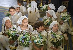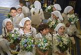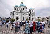 Праздник явления иконы Пресвятой Богородицы во граде Казани. Божественная литургия после Крестного хода с Казанской иконой Божией Матери. Священнослужители и детский хор во время богослужения.