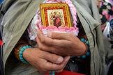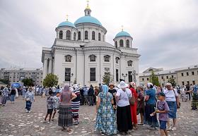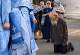 Праздник явления иконы Пресвятой Богородицы во граде Казани. Божественная литургия после Крестного хода с Казанской иконой Божией Матери. Верующие во время богослужения.