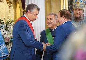Праздник явления иконы Пресвятой Богородицы во граде Казани. Божественная литургия после Крестного хода с Казанской иконой Божией Матери. Глава Республики Татарстан Рустам Минниханов (в центре) и председатель Либерально-демократической партии России (ЛДПР) Леонид Слуцкий (слева) после церемонии награждения церковными орденами I степени.