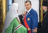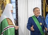 Праздник явления иконы Пресвятой Богородицы во граде Казани. Божественная литургия после Крестного хода с Казанской иконой Божией Матери. Патриарх Московский и Всея Руси Кирилл (слева) награждает главу Республики Татарстан Рустама Минниханова (справа) орденом Славы и Чести.
