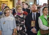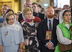 Праздник явления иконы Пресвятой Богородицы во граде Казани. Божественная литургия после Крестного хода с Казанской иконой Божией Матери. Председатель наблюдательного совета фонда "Елисаветинско-Сергиевское просветительское общество" Анна Громова (слева) во время богослужения.