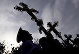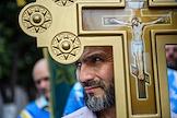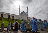 Праздник явления иконы Пресвятой Богородицы во граде Казани. Крестный ход с Казанской иконой Божией Матери из Благовещенского собора Кремля до Казанского Богородицкого мужского монастыря. Жанровая фотография. Православные золотые кресты на фоне мечети.