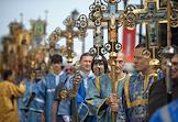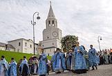 Праздник явления иконы Пресвятой Богородицы во граде Казани. Крестный ход с Казанской иконой Божией Матери из Благовещенского собора Кремля до Казанского Богородицкого мужского монастыря. Священнослужители во время Крестного хода.