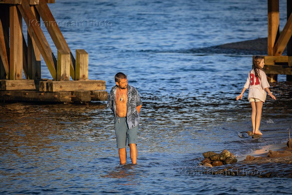 Жанровая фотография. Мужчина с ребенком стоят в воде.