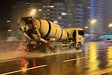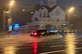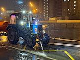 Жанровая фотография. Ливень в городе. Трактор с поливальной системой коммунальной службы города работает на улице в дождь.