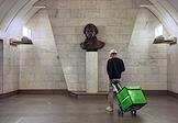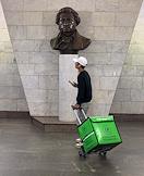 Виды Московского метрополитена. Жанровая фотография. Курьер доставки продуктов Ecomarket.ru у бюста поэта Александра Пушкина на станции метро "Пушкинская".