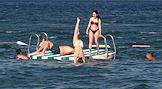 Жанровая фотография. Отдых на средиземноморском побережье Ичмелера. Люди ныряют в море с надувной платформы.