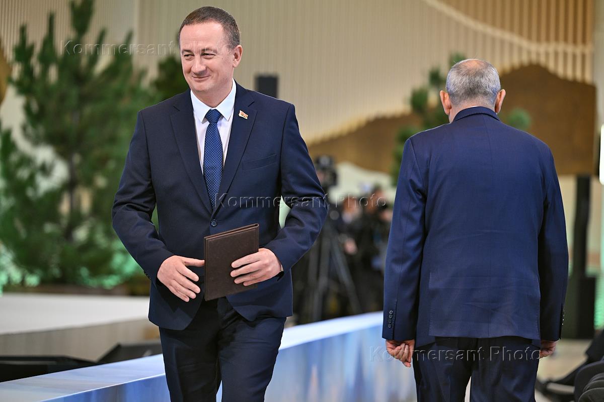 Рабочая поездка председателя правительства России Михаила Мишустина в Сибирский федеральный округ. Международная экологическая конференция на территории курорта "Манжерок". Слева направо: премьер-министр Казахстана Олжас Бектенов, председатель правительства России Михаил Мишустин и премьер-министр Белоруссии Александр Турчин перед началом совместного фотографирования глав делегаций Международной экологической конференции.