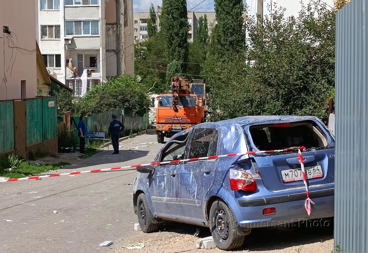 Последствие взрыва бытового газа в многоэтажном жилом доме на улице Блинова. Произошло разрушение углового подъезда с 7 по 10 этаж. По данным МЧС России, при взрыве газа погибли три человека. Машины спасательных служб на месте происшествия.
