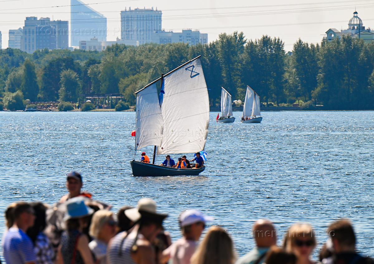 Празднование Дня Военно-Морского Флота (ВМФ) России на Северном речном вокзале. Жанровая фотография. Показательные выходы судов детского морского центра имени Петра Великого и соревнования по академической гребле на праздновании.