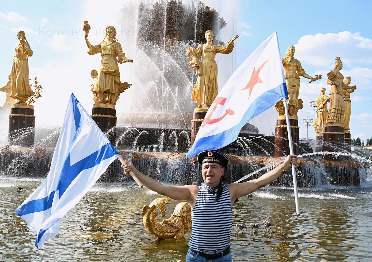 Празднование Дня Военно-Морского Флота (ВМФ) России на территории ВДНХ. Бывшие военнослужащие ВМФ России на праздновании у фонтана "Дружба народов".