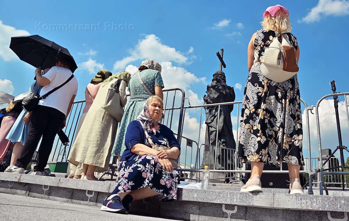 Празднование Дня крещения Руси и Дня памяти святого равноапостольного великого князя Владимира. Крестный ход с мощами святого равноапостольного князя Владимира от Успенского собора Московского Кремля к памятнику князю Владимиру на Боровицком холме. Верующие во время праздничного молебна у памятника князю Владимиру.